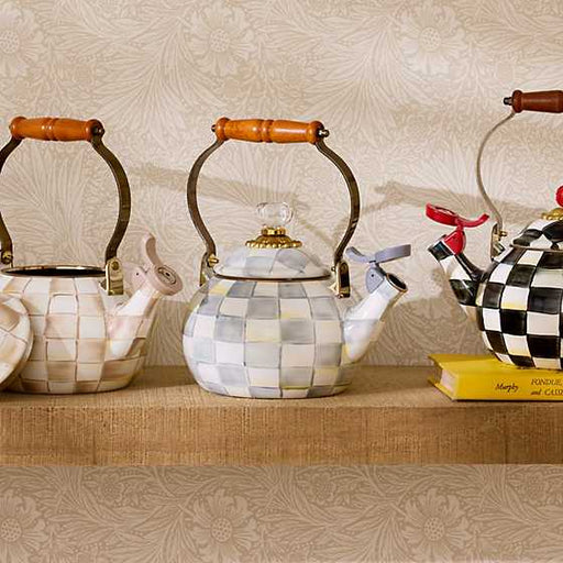 View full detailsProduct Details Bubbling over with MacKenzie-Childs style, our Emerald Check Enamel 3 Quart Tea Kettle will have you finding new reasons to put the...