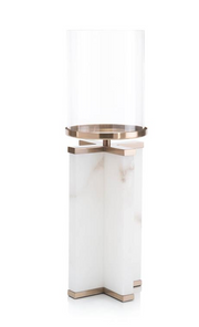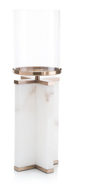 Alabaster candle holder in cross configuration with bronze finish cap and base. Glass shade included.