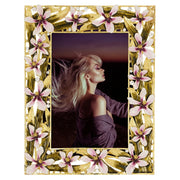 Bring the delicate beauty of the orchid into your home with these majestic picture frames. Gold finished pewter with vibrant purple and green hued hand-enameling and hand-set clear European crystals. Elegant champagne hued moiré silk back, with easel designed for vertical or horizontal placement. Signature luxury gift box included.