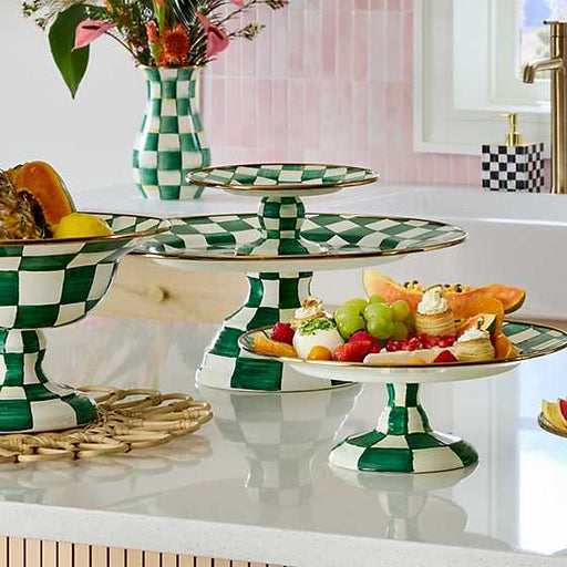 MacKenzie-ChildsDetails The Rosy Check® Mini Pedestal Platter is the center of attention at every gathering. It features checks hand-painted in rosy hues over a st...