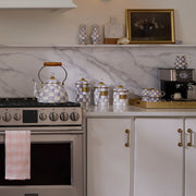 Heavy-gauge, hand-glazed steel underbody with hand-painted Violet Checks, rimmed in bronzed stainless steel. Brass and glass accents. Silicone seal inside lid. Pieces may vary due to the handmade nature of each product. Imported.