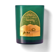 The JESUS CHRIST Nativity Candle is elegantly presented in a green glass holder, adorned with a serene nativity scene. The packaging is equally beautiful, featuring a depiction of the nativity that evokes the spirit of Christmas. The embedded Italian prayer coin, revealed once the candle has burned down, is a special touch that adds to the candle's spiritual significance.