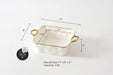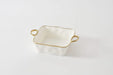 Square Baking Dish in Golden Handles. Impress with your culinary skill and presentation by serving up delicious entrees or pastries in these elegant dishes. Gleaming white porcelain with smooth and graceful rim and handles in gold. Food safe. Dishwasher safe. Oven safe to 500°. Easy Care.
