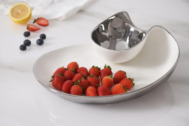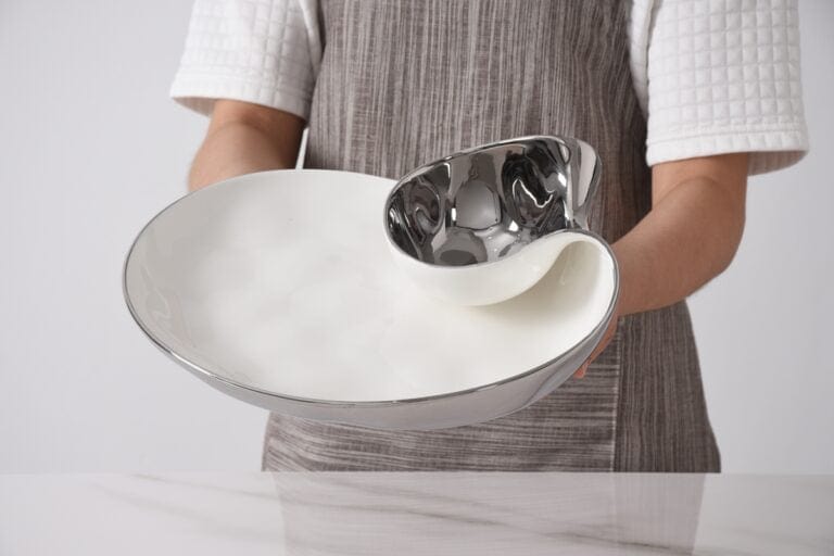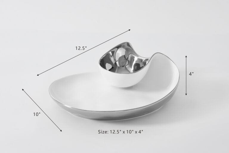 A modern take on your classic chip and dip. Perfect for any dip combo: hummus and pita, salsa and tortilla chips, veggies and ranch or our favorite berries and whipped cream! This piece also makes a stunning display for sushi and soy sauce or crab cakes and tartar sauce. Crafted in a luxurious white high-fired porcelain and dazzling silver. Food safe, tarnish free, dishwasher safe, oven safe. Easy Care.