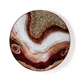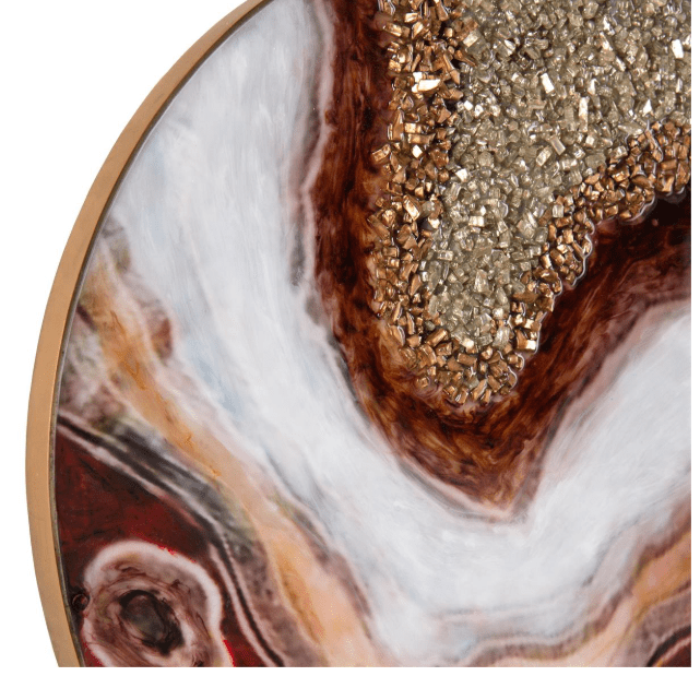 With the crystalline beauty of a geode, this three-dimensional wall art makes a prominent statement with the fluid movement of rich red, white, and gold colors. Accentuated with clear and gold tumbled glass, this piece is encircled with a brass band.