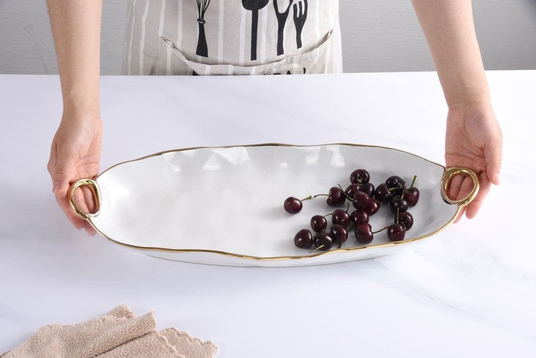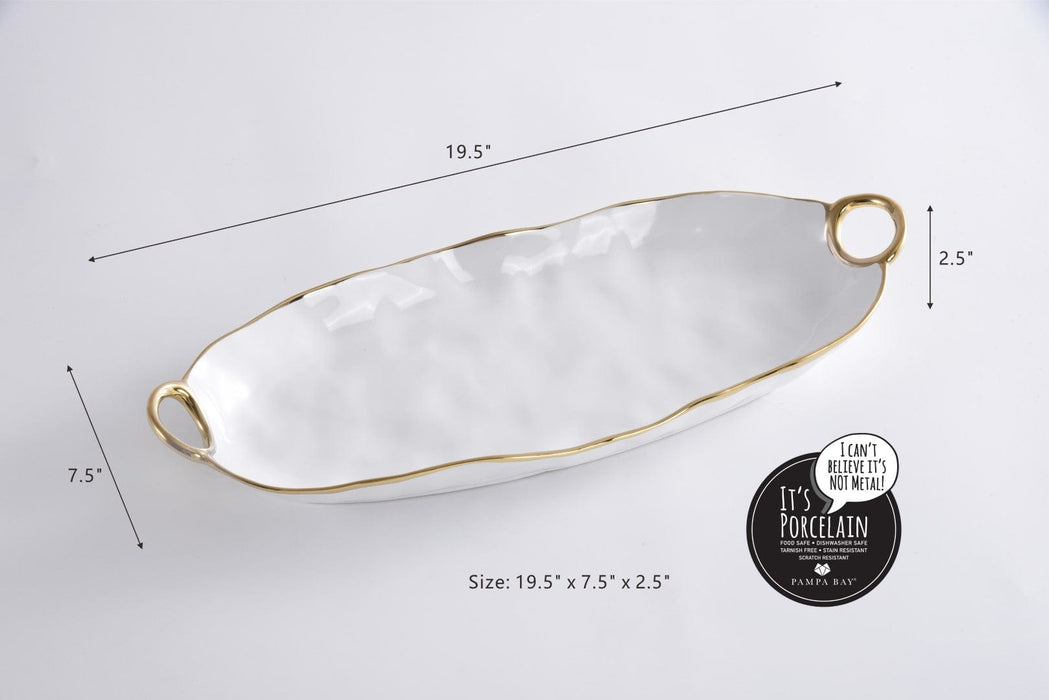 Deep Long Server from our Golden Handles Collection. This platter is great for serving an assortment of freshly sliced breads or a variety of appetizers from stuffed mushrooms to baby lamb chops to yakitori. Asparagus, carrots, green beans, even a whole fish all are stunning on this piece. Gleaming white porcelain with smooth and graceful handles in gold titanium. Food safe. Dishwasher safe. Oven safe up to 500°. Easy Care.