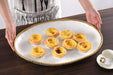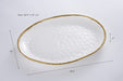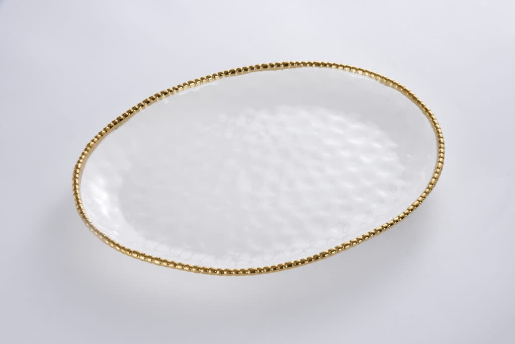 Large Oval Platter in Golden Salerno. Perfect for tempting guests with your delicious main course or hearty sides. Use for dessert to display an assortment of treats and sweets! Generously sized at over 18” in length. Gleaming white porcelain with lustrous gold beads in titanium. Food safe. Food safe, tarnish free, dishwasher safe, oven safe to 500°. Tarnish and stain-free. Easy Care.